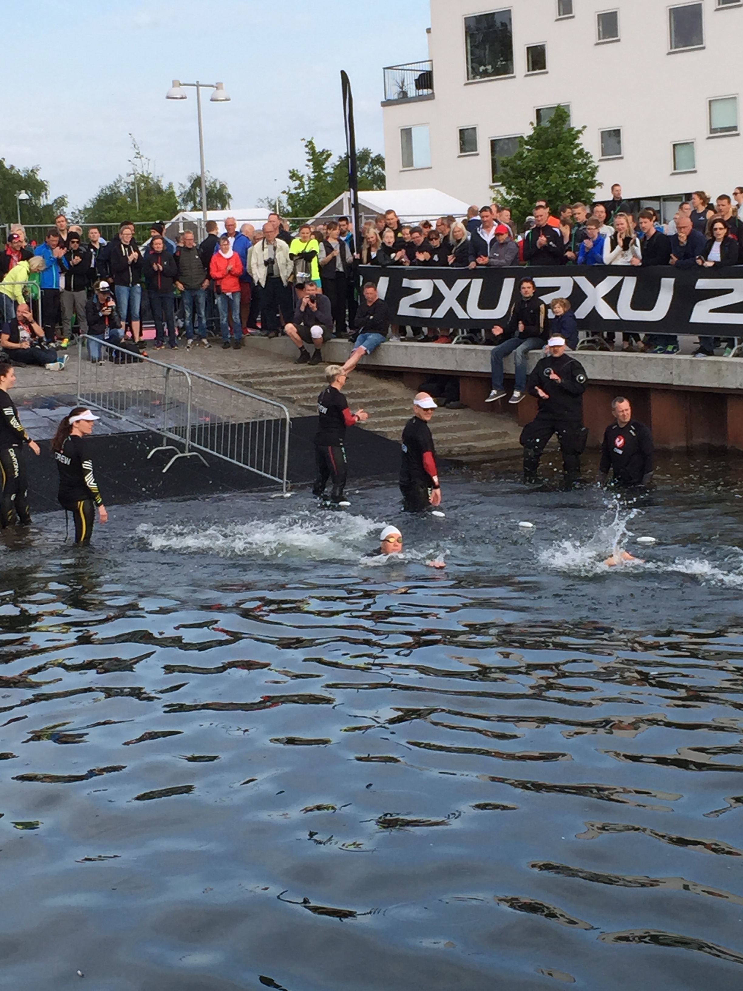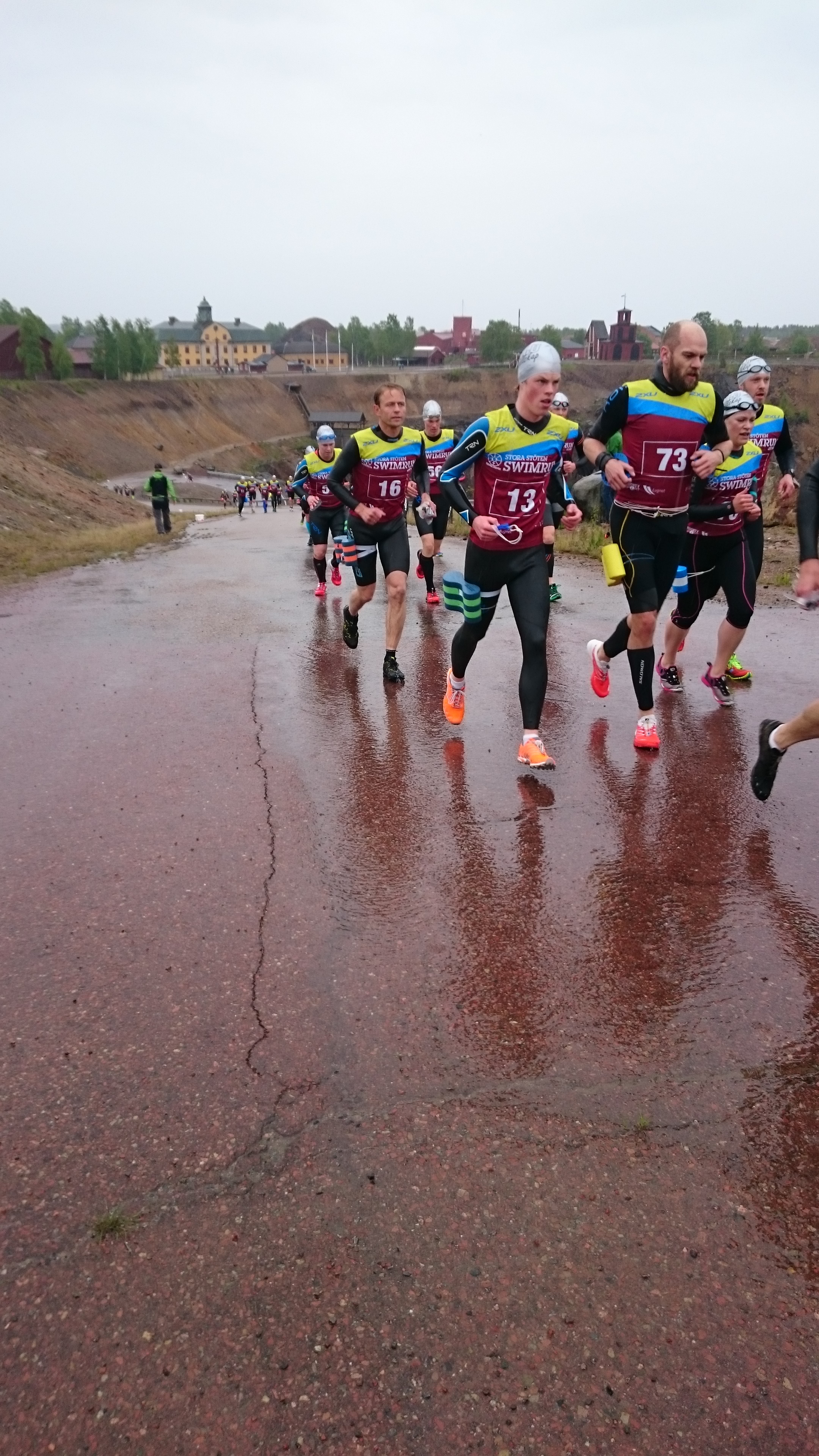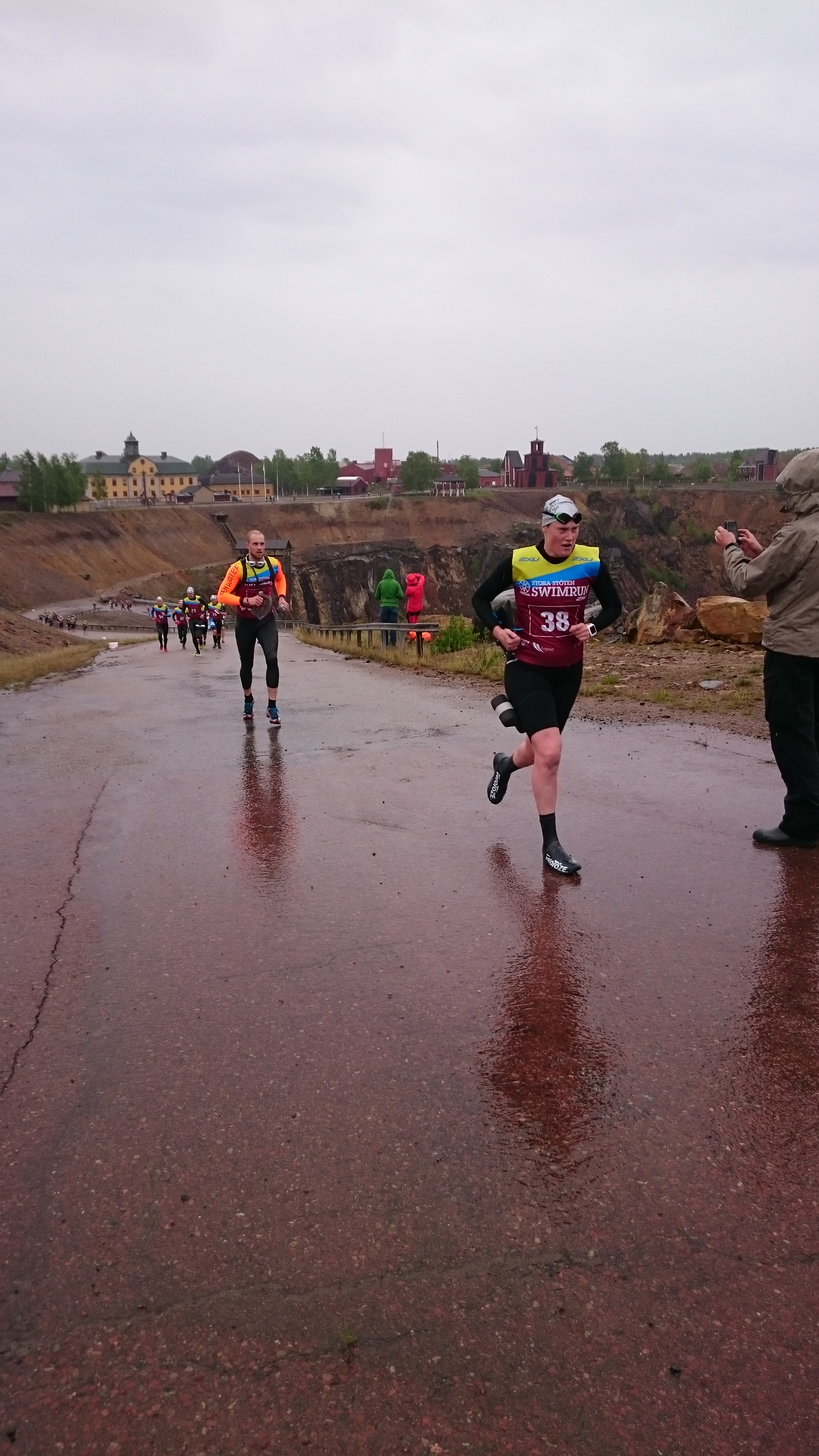 Inte den snabbaste banan men lugna vatten och bra vattentemperatur! Tur att det var en liten sjö, på en vecka steg temperaturen från 13 grader till vad som utan problem var över 16 grader. Glad för att det inte blev kortad simning och jag lyckades faktiskt komma upp 3:a ur vattnet!! Försökte hänga på de två snabbare tjejerna vid start men det gick för fort så jag visste att det inte skulle hålla. Sen var det faktiskt jag som simmade snabbast av övriga, men jag var så dålig på att navigera! Jag har bara simmat 20min i öppet vatten innan, och jag drar väldigt mycket till höger av någon anledning så varvet blev onödigt långt när vi hade bojarna på vänster sida. Drog ifrån en av tyskorna men mötte henne ändå vid varje boj, så efter halva varvet bestämde jag mig för att lägga mig på fötter och låta henne sköta navigeringen. Efter varvningen på land hade vi ju dock bojarna på höger sida och då gick det bättre med navigeringen, så jag kunde skapa lite lucka! 1.02 känns ok, helt klart åt rätt håll då jag siktar på att ligga under timmen.
