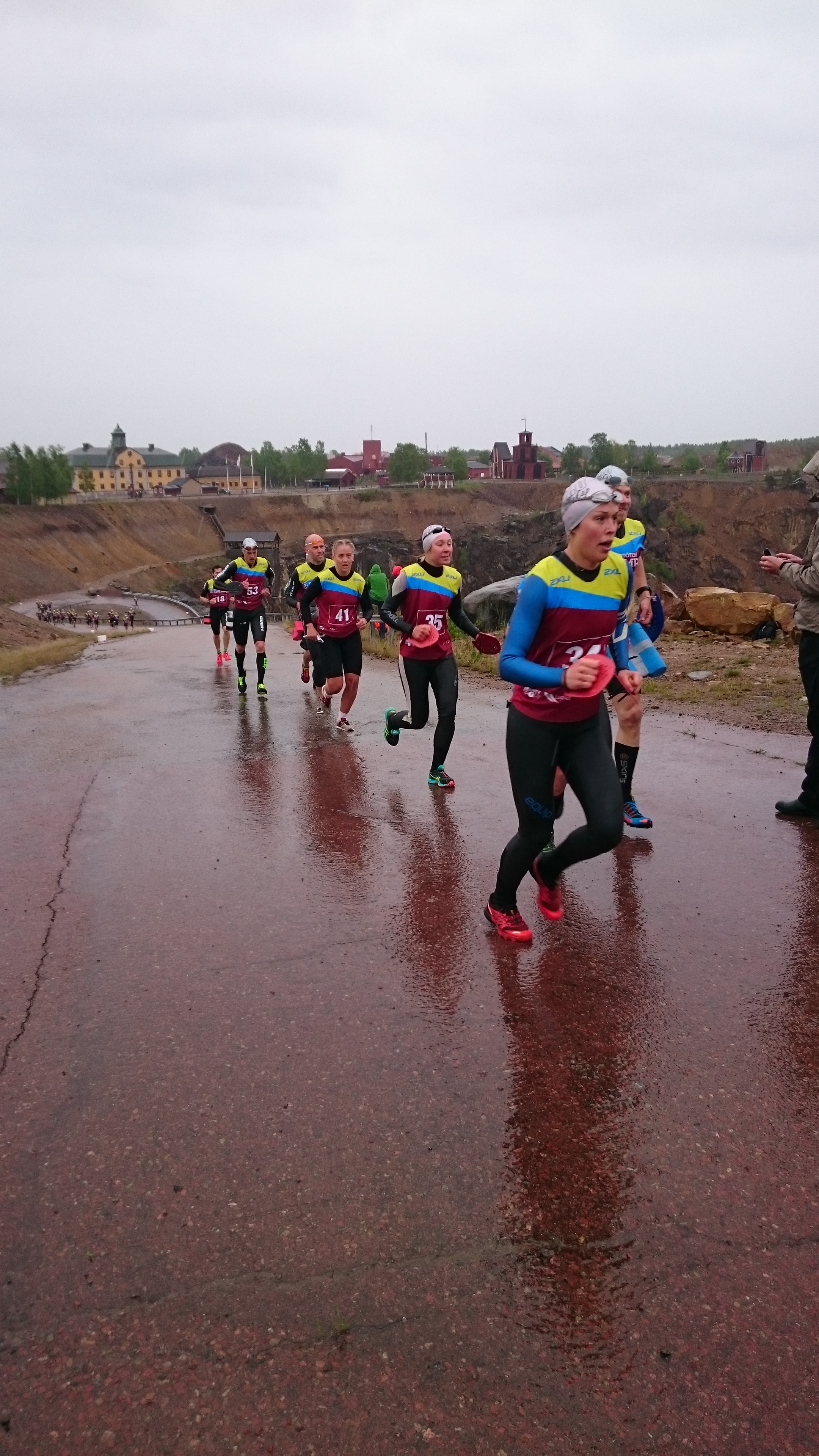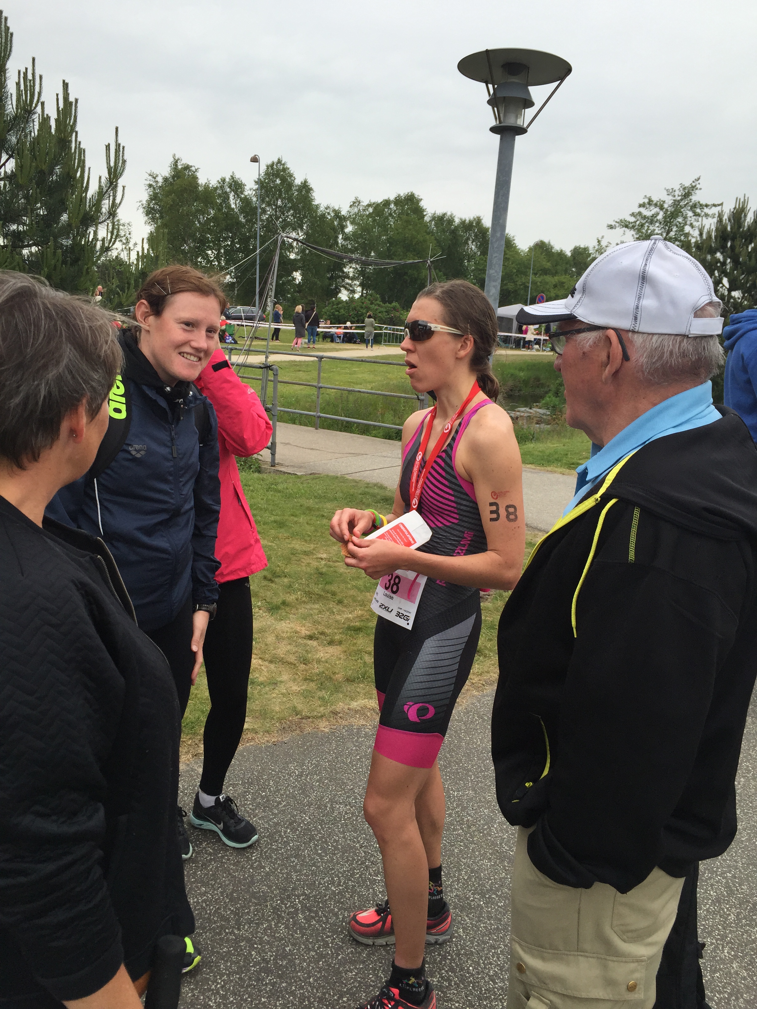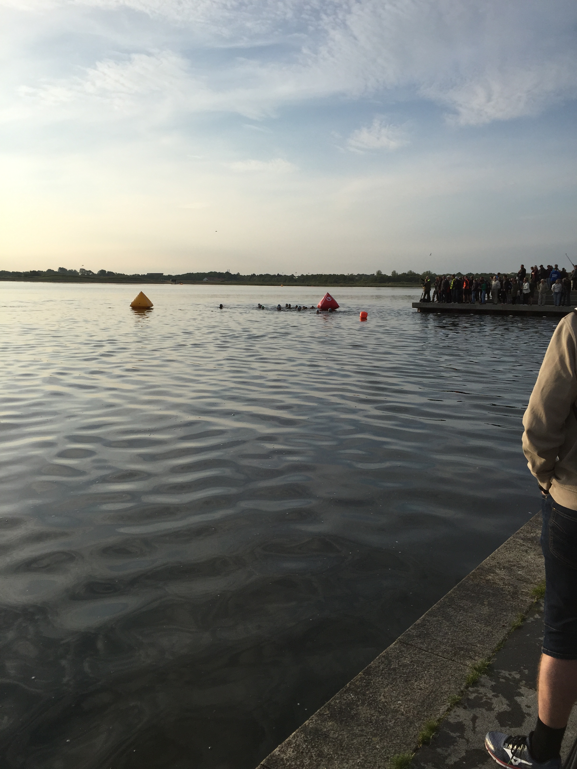 Inte den snabbaste banan men lugna vatten och bra vattentemperatur! Tur att det var en liten sjö, på en vecka steg temperaturen från 13 grader till vad som utan problem var över 16 grader. Glad för att det inte blev kortad simning och jag lyckades faktiskt komma upp 3:a ur vattnet!! Försökte hänga på de två snabbare tjejerna vid start men det gick för fort så jag visste att det inte skulle hålla. Sen var det faktiskt jag som simmade snabbast av övriga, men jag var så dålig på att navigera! Jag har bara simmat 20min i öppet vatten innan, och jag drar väldigt mycket till höger av någon anledning så varvet blev onödigt långt när vi hade bojarna på vänster sida. Drog ifrån en av tyskorna men mötte henne ändå vid varje boj, så efter halva varvet bestämde jag mig för att lägga mig på fötter och låta henne sköta navigeringen. Efter varvningen på land hade vi ju dock bojarna på höger sida och då gick det bättre med navigeringen, så jag kunde skapa lite lucka! 1.02 känns ok, helt klart åt rätt håll då jag siktar på att ligga under timmen.
